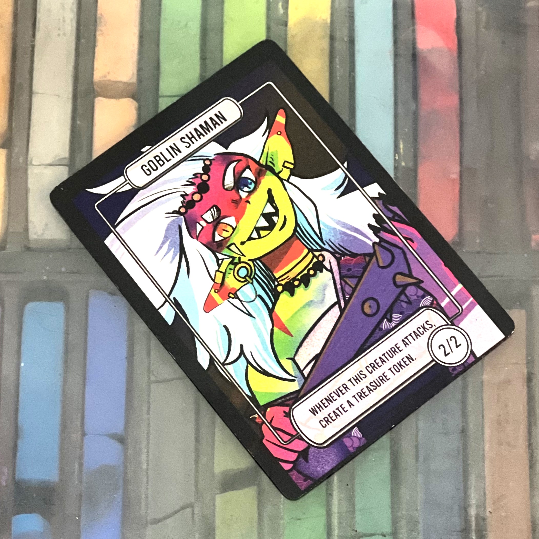 This is a Goblin Shaman token to used in the game Magic the Gathering.